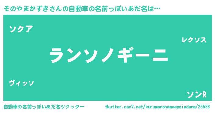 そのやまかずきさんの自動車の名前っぽいあだ名は… 『ランソノギーニ』『ソクア』『ソンR』 ツクッター #自動車の名前っぽいあだ名ツクッター http://tkutter.nan7.net/kurumanonamaepoiadana/25583/
