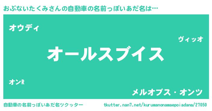 おぶないたくみさんの自動車の名前っぽいあだ名は… 『オールスブイス』『オウディ』『メルオブス・オンツ』 ツクッター #自動車の名前っぽいあだ名ツクッター http://tkutter.nan7.net/kurumanonamaepoiadana/27050/