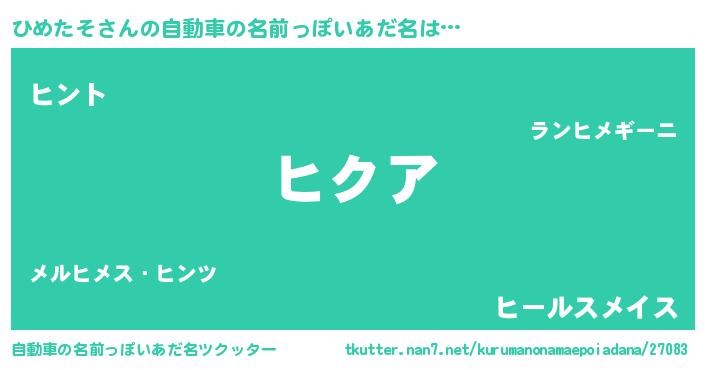 ひめたそさんの自動車の名前っぽいあだ名は… 『ヒクア』『ヒント』『ヒールスメイス』 ツクッター #自動車の名前っぽいあだ名ツクッター http://tkutter.nan7.net/kurumanonamaepoiadana/27083/