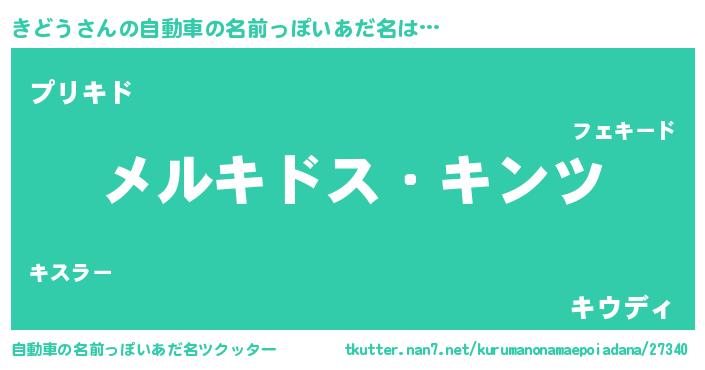 きどうさんの自動車の名前っぽいあだ名は… 『メルキドス・キンツ』『プリキド』『キウディ』 ツクッター #自動車の名前っぽいあだ名ツクッター http://tkutter.nan7.net/kurumanonamaepoiadana/27340/