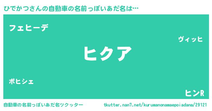 ひでかつさんの自動車の名前っぽいあだ名は… 『ヒクア』『フェヒーデ』『ヒンR』 ツクッター #自動車の名前っぽいあだ名ツクッター http://tkutter.nan7.net/kurumanonamaepoiadana/29121/