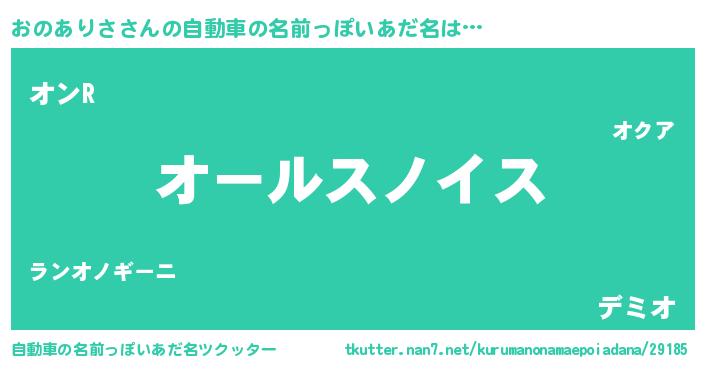 おのありささんの自動車の名前っぽいあだ名は… 『オールスノイス』『オンR』『デミオ』 ツクッター #自動車の名前っぽいあだ名ツクッター http://tkutter.nan7.net/kurumanonamaepoiadana/29185/