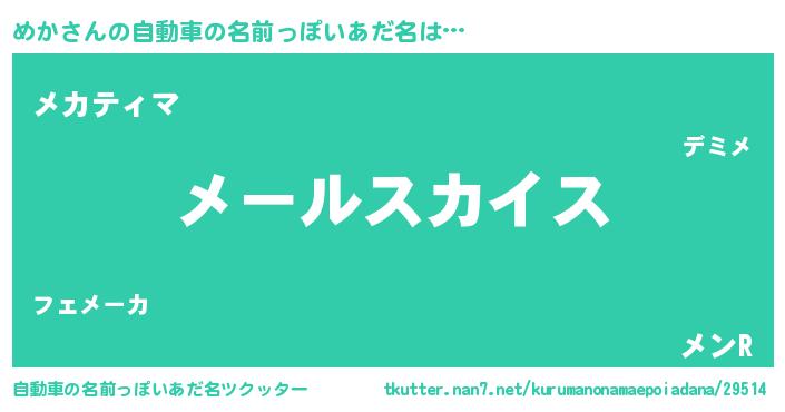 めかさんの自動車の名前っぽいあだ名は… 『メールスカイス』『メカティマ』『メンR』 ツクッター #自動車の名前っぽいあだ名ツクッター http://tkutter.nan7.net/kurumanonamaepoiadana/29514/
