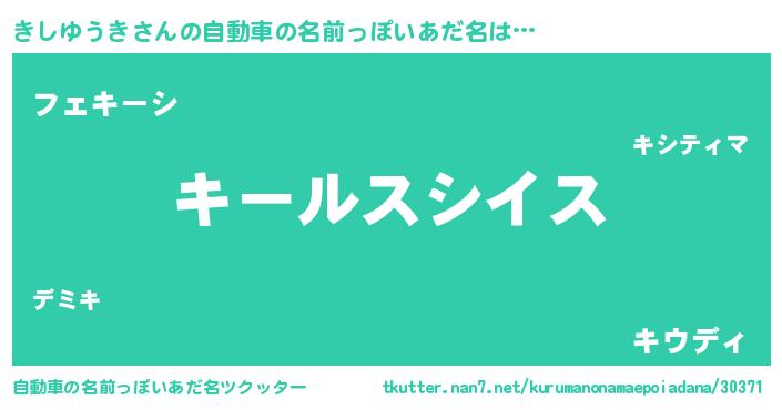 きしゆうきさんの自動車の名前っぽいあだ名は… 『キールスシイス』『フェキーシ』『キウディ』 ツクッター #自動車の名前っぽいあだ名ツクッター http://tkutter.nan7.net/kurumanonamaepoiadana/30371/