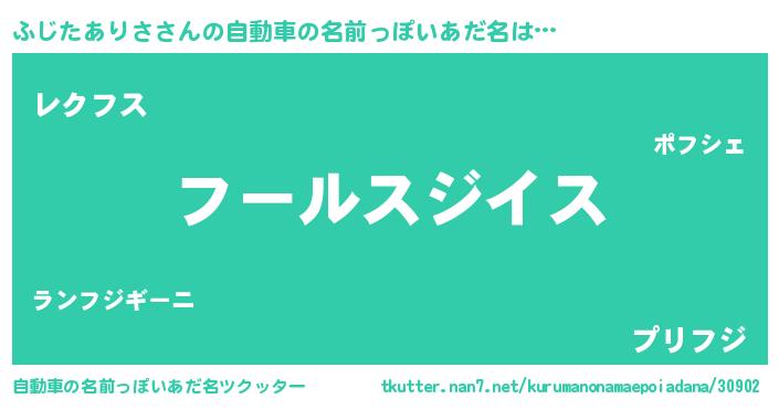 ふじたありささんの自動車の名前っぽいあだ名は… 『フールスジイス』『レクフス』『プリフジ』 ツクッター #自動車の名前っぽいあだ名ツクッター http://tkutter.nan7.net/kurumanonamaepoiadana/30902/