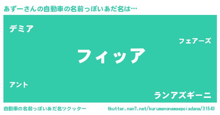 あずーさんの自動車の名前っぽいあだ名は… 『フィッア』『デミア』『ランアズギーニ』 ツクッター #自動車の名前っぽいあだ名ツクッター http://tkutter.nan7.net/kurumanonamaepoiadana/31543/