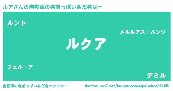 | 女子向けラノベタイトル風あだ名 | 『ルアの雑貨屋さん』『ルア様がみてる』 |