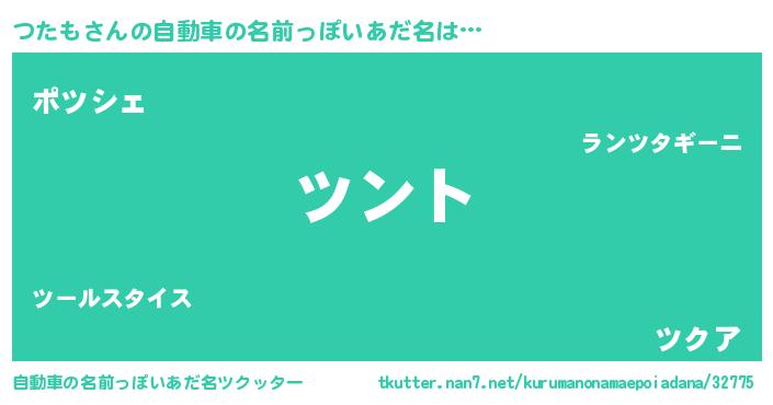 つたもさんの自動車の名前っぽいあだ名は… 『ツント』『ポツシェ』『ツクア』 ツクッター #自動車の名前っぽいあだ名ツクッター http://tkutter.nan7.net/kurumanonamaepoiadana/32775/