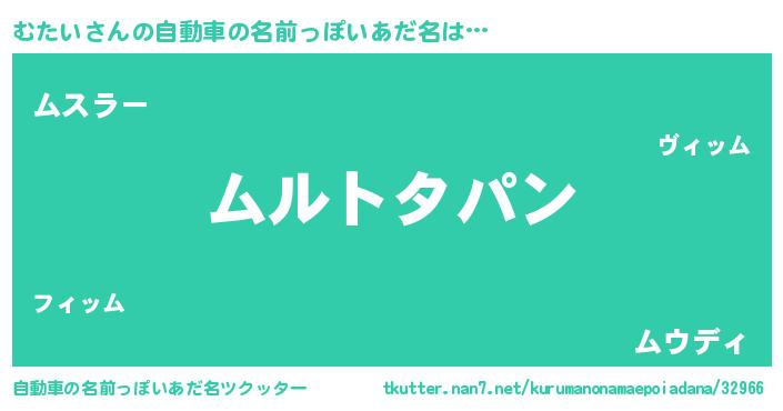 むたいさんの自動車の名前っぽいあだ名は… 『ムルトタパン』『ムスラー』『ムウディ』 ツクッター #自動車の名前っぽいあだ名ツクッター http://tkutter.nan7.net/kurumanonamaepoiadana/32966/