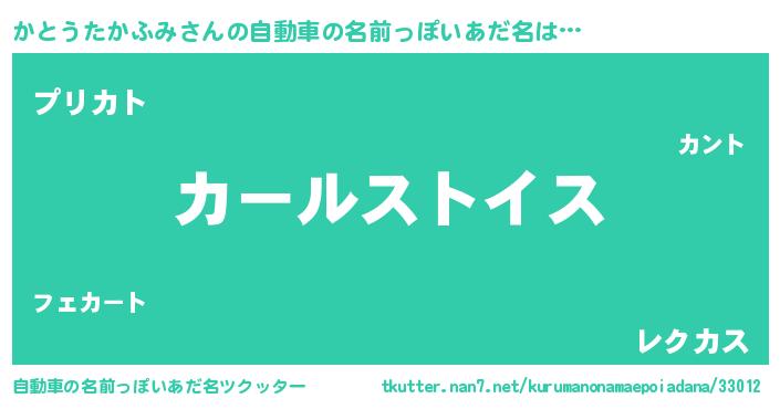 かとうたかふみさんの自動車の名前っぽいあだ名は… 『カールストイス』『プリカト』『レクカス』 ツクッター #自動車の名前っぽいあだ名ツクッター http://tkutter.nan7.net/kurumanonamaepoiadana/33012/