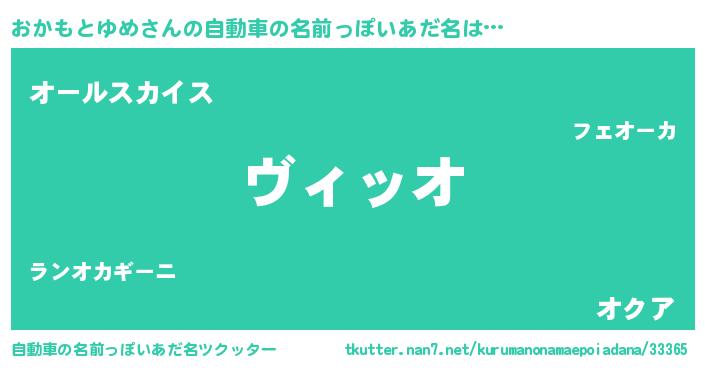 おかもとゆめさんの自動車の名前っぽいあだ名は… 『ヴィッオ』『オールスカイス』『オクア』 ツクッター #自動車の名前っぽいあだ名ツクッター http://tkutter.nan7.net/kurumanonamaepoiadana/33365/