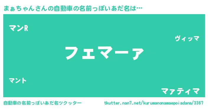 まぁちゃんさんの自動車の名前っぽいあだ名は… 『フェマーァ』『マンR』『マァティマ』 ツクッター #自動車の名前っぽいあだ名ツクッター http://tkutter.nan7.net/kurumanonamaepoiadana/3367/