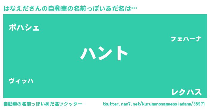 はなえださんの自動車の名前っぽいあだ名は… 『ハント』『ポハシェ』『レクハス』 ツクッター #自動車の名前っぽいあだ名ツクッター http://tkutter.nan7.net/kurumanonamaepoiadana/35971/