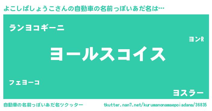 よこしばしょうこさんの自動車の名前っぽいあだ名は… 『ヨールスコイス』『ランヨコギーニ』『ヨスラー』 ツクッター #自動車の名前っぽいあだ名ツクッター http://tkutter.nan7.net/kurumanonamaepoiadana/36835/