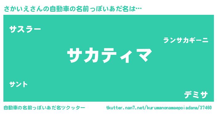 さかいえさんの自動車の名前っぽいあだ名は… 『サカティマ』『サスラー』『デミサ』 ツクッター #自動車の名前っぽいあだ名ツクッター http://tkutter.nan7.net/kurumanonamaepoiadana/37460/