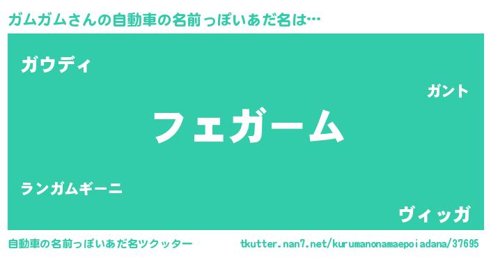 ガムガムさんの自動車の名前っぽいあだ名は… 『フェガーム』『ガウディ』『ヴィッガ』 ツクッター #自動車の名前っぽいあだ名ツクッター http://tkutter.nan7.net/kurumanonamaepoiadana/37695/