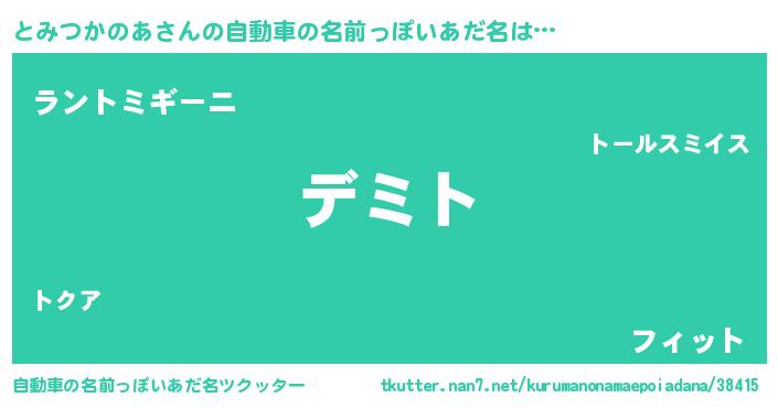 とみつかのあさんの自動車の名前っぽいあだ名は… 『デミト』『ラントミギーニ』『フィット』 ツクッター #自動車の名前っぽいあだ名ツクッター http://tkutter.nan7.net/kurumanonamaepoiadana/38415/