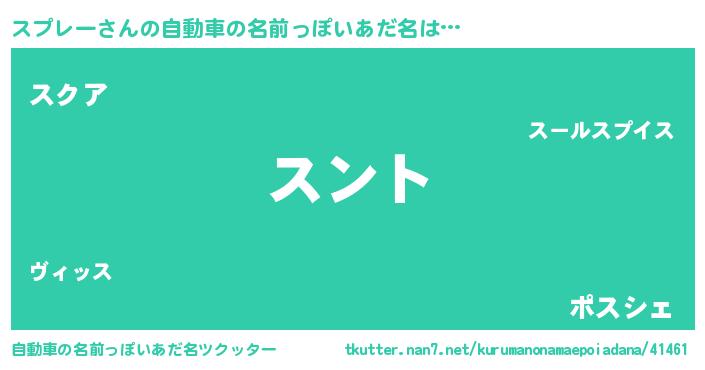 スプレーさんの自動車の名前っぽいあだ名は… 『スント』『スクア』『ポスシェ』 ツクッター #自動車の名前っぽいあだ名ツクッター http://tkutter.nan7.net/kurumanonamaepoiadana/41461/