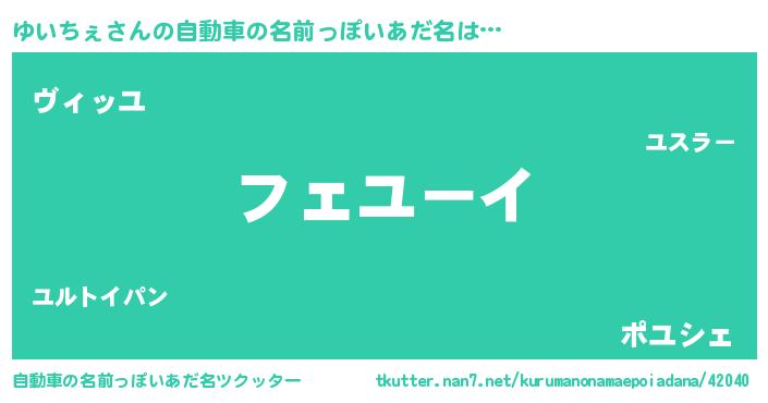 ゆいちぇさんの自動車の名前っぽいあだ名は… 『フェユーイ』『ヴィッユ』『ポユシェ』 ツクッター #自動車の名前っぽいあだ名ツクッター http://tkutter.nan7.net/kurumanonamaepoiadana/42040/