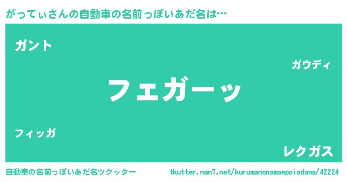 がってぃさんの自動車の名前っぽいあだ名は… 『フェガーッ』『ガント』『レクガス』 ツクッター #自動車の名前っぽいあだ名ツクッター http://tkutter.nan7.net/kurumanonamaepoiadana/42224/