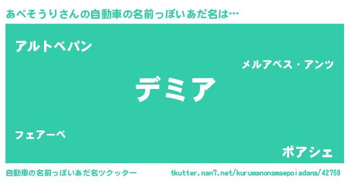 | 男性向けラノベタイトル風あだ名 | 『あべそうりという概念が存在しない退屈な世界 』 |