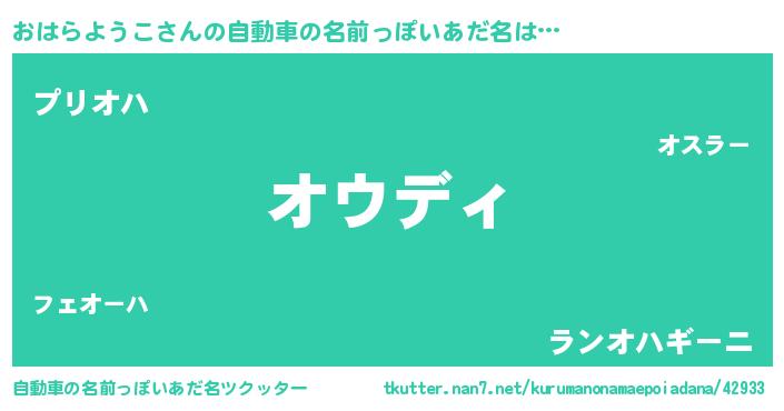 おはらようこさんの自動車の名前っぽいあだ名は… 『オウディ』『プリオハ』『ランオハギーニ』 ツクッター #自動車の名前っぽいあだ名ツクッター http://tkutter.nan7.net/kurumanonamaepoiadana/42933/