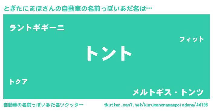 とぎたにまほさんの自動車の名前っぽいあだ名は… 『トント』『ラントギギーニ』『メルトギス・トンツ』 ツクッター #自動車の名前っぽいあだ名ツクッター http://tkutter.nan7.net/kurumanonamaepoiadana/44198/