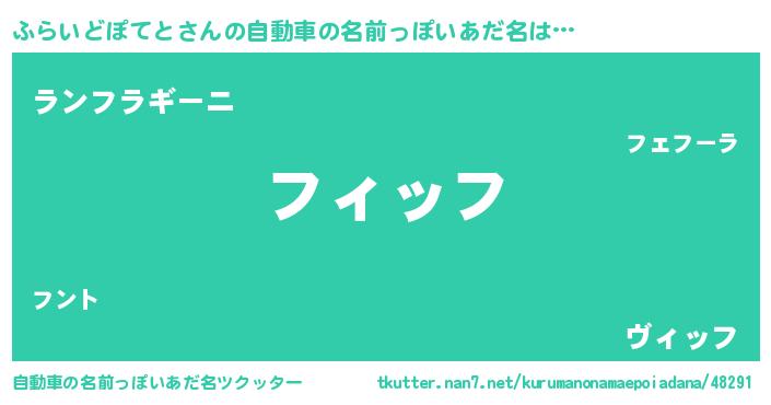 ふらいどぽてとさんの自動車の名前っぽいあだ名は… 『フィッフ』『ランフラギーニ』『ヴィッフ』 ツクッター #自動車の名前っぽいあだ名ツクッター http://tkutter.nan7.net/kurumanonamaepoiadana/48291/