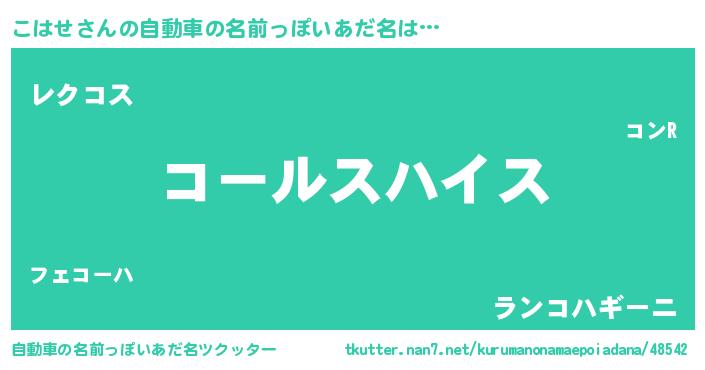 こはせさんの自動車の名前っぽいあだ名は… 『コールスハイス』『レクコス』『ランコハギーニ』 ツクッター #自動車の名前っぽいあだ名ツクッター http://tkutter.nan7.net/kurumanonamaepoiadana/48542/