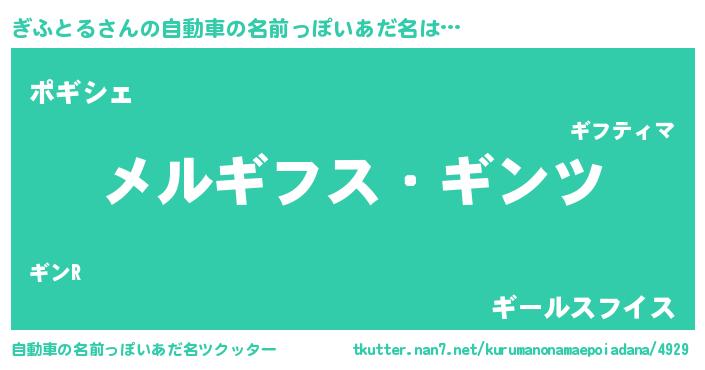 ぎふとるさんの自動車の名前っぽいあだ名は… 『メルギフス・ギンツ』『ポギシェ』『ギールスフイス』 ツクッター #自動車の名前っぽいあだ名ツクッター http://tkutter.nan7.net/kurumanonamaepoiadana/4929/