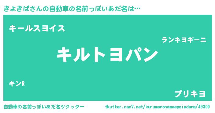 きよきばさんの自動車の名前っぽいあだ名は… 『キルトヨパン』『キールスヨイス』『プリキヨ』 ツクッター #自動車の名前っぽいあだ名ツクッター http://tkutter.nan7.net/kurumanonamaepoiadana/49300/