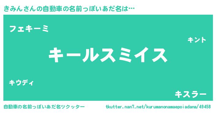 きみんさんの自動車の名前っぽいあだ名は… 『キールスミイス』『フェキーミ』『キスラー』 ツクッター #自動車の名前っぽいあだ名ツクッター http://tkutter.nan7.net/kurumanonamaepoiadana/49458/