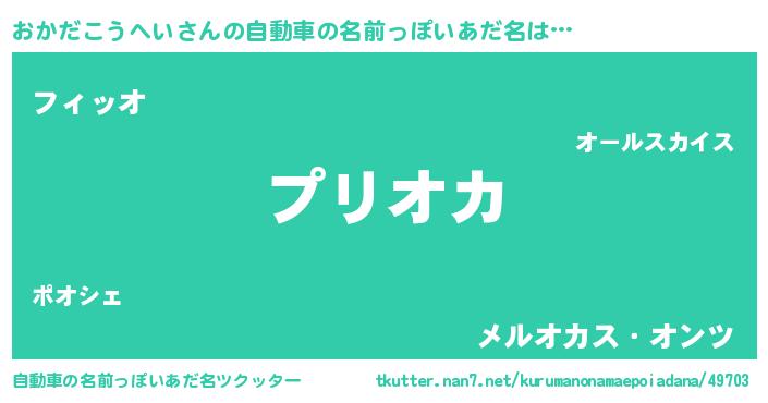おかだこうへいさんの自動車の名前っぽいあだ名は… 『プリオカ』『フィッオ』『メルオカス・オンツ』 ツクッター #自動車の名前っぽいあだ名ツクッター http://tkutter.nan7.net/kurumanonamaepoiadana/49703/