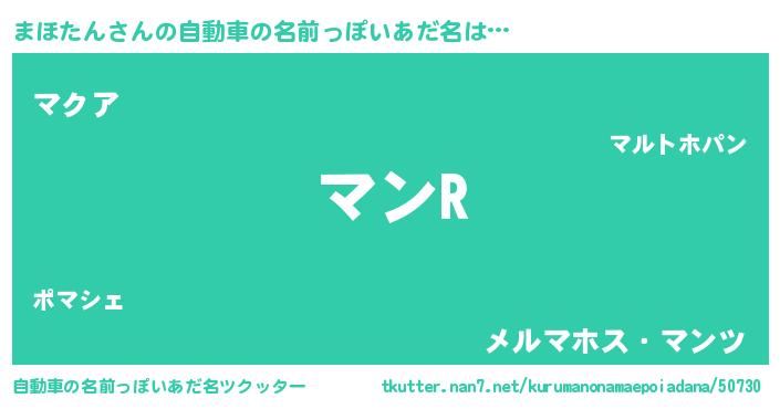 まほたんさんの自動車の名前っぽいあだ名は… 『マンR』『マクア』『メルマホス・マンツ』 ツクッター #自動車の名前っぽいあだ名ツクッター http://tkutter.nan7.net/kurumanonamaepoiadana/50730/
