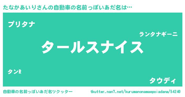 たなかあいりさんの自動車の名前っぽいあだ名は… 『タールスナイス』『プリタナ』『タウディ』 ツクッター #自動車の名前っぽいあだ名ツクッター http://tkutter.nan7.net/kurumanonamaepoiadana/54240/