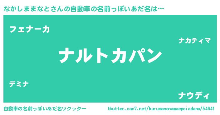 なかしままなとさんの自動車の名前っぽいあだ名は… 『ナルトカパン』『フェナーカ』『ナウディ』 ツクッター #自動車の名前っぽいあだ名ツクッター http://tkutter.nan7.net/kurumanonamaepoiadana/54641/