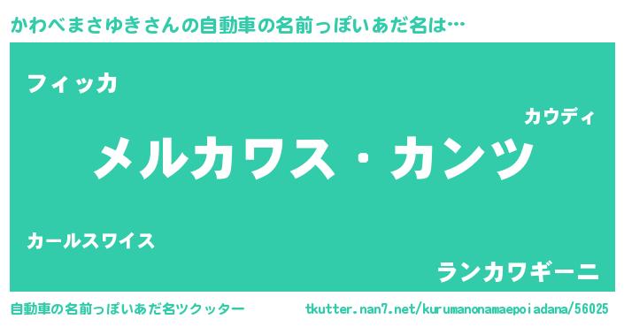 かわべまさゆきさんの自動車の名前っぽいあだ名は… 『メルカワス・カンツ』『フィッカ』『ランカワギーニ』 ツクッター #自動車の名前っぽいあだ名ツクッター http://tkutter.nan7.net/kurumanonamaepoiadana/56025/
