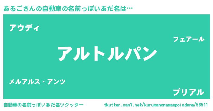 あるごさんの自動車の名前っぽいあだ名は… 『アルトルパン』『アウディ』『プリアル』 ツクッター #自動車の名前っぽいあだ名ツクッター http://tkutter.nan7.net/kurumanonamaepoiadana/56511/