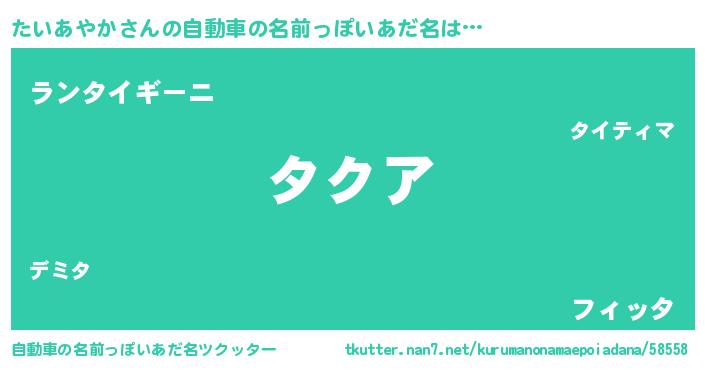 たいあやかさんの自動車の名前っぽいあだ名は… 『タクア』『ランタイギーニ』『フィッタ』 ツクッター #自動車の名前っぽいあだ名ツクッター http://tkutter.nan7.net/kurumanonamaepoiadana/58558/