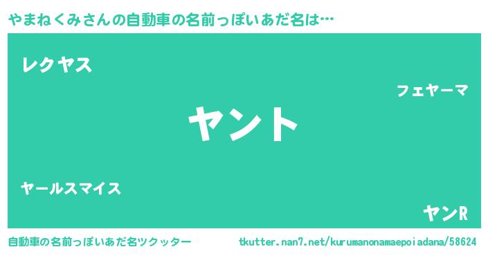 やまねくみさんの自動車の名前っぽいあだ名は… 『ヤント』『レクヤス』『ヤンR』 ツクッター #自動車の名前っぽいあだ名ツクッター http://tkutter.nan7.net/kurumanonamaepoiadana/58624/