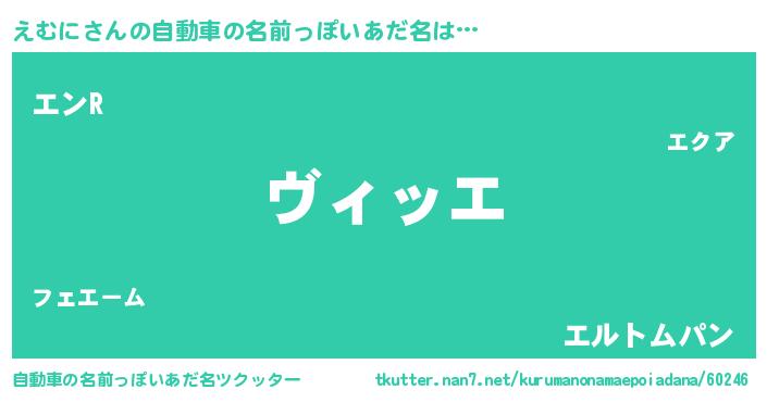 えむにさんの自動車の名前っぽいあだ名は… 『ヴィッエ』『エンR』『エルトムパン』 ツクッター #自動車の名前っぽいあだ名ツクッター http://tkutter.nan7.net/kurumanonamaepoiadana/60246/