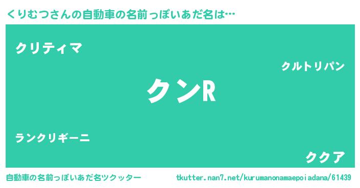 くりむつさんの自動車の名前っぽいあだ名は… 『クンR』『クリティマ』『ククア』 ツクッター #自動車の名前っぽいあだ名ツクッター http://tkutter.nan7.net/kurumanonamaepoiadana/61439/