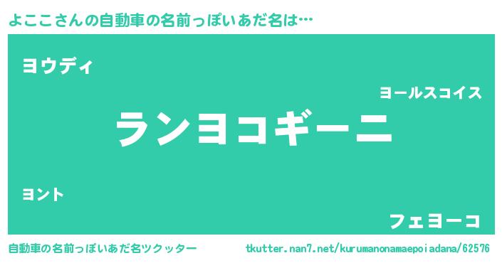 よここさんの自動車の名前っぽいあだ名は… 『ランヨコギーニ』『ヨウディ』『フェヨーコ』 ツクッター #自動車の名前っぽいあだ名ツクッター http://tkutter.nan7.net/kurumanonamaepoiadana/62576/