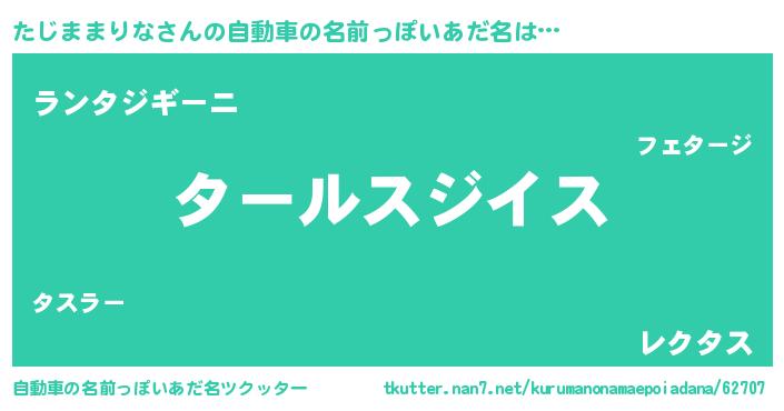 たじままりなさんの自動車の名前っぽいあだ名は… 『タールスジイス』『ランタジギーニ』『レクタス』 ツクッター #自動車の名前っぽいあだ名ツクッター http://tkutter.nan7.net/kurumanonamaepoiadana/62707/