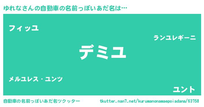 ゆれなさんの自動車の名前っぽいあだ名は… 『デミユ』『フィッユ』『ユント』 ツクッター #自動車の名前っぽいあだ名ツクッター http://tkutter.nan7.net/kurumanonamaepoiadana/63758/
