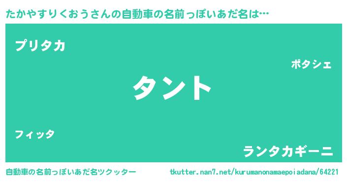 | 男性向けラノベタイトル風あだ名 | 『たかやすりくおうの嫁は女の子じゃないと思った?』 |