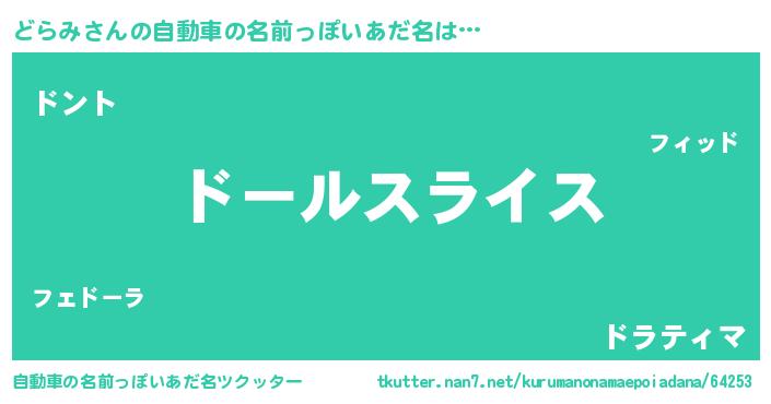 どらみさんの自動車の名前っぽいあだ名は… 『ドールスライス』『ドント』『ドラティマ』 ツクッター #自動車の名前っぽいあだ名ツクッター http://tkutter.nan7.net/kurumanonamaepoiadana/64253/