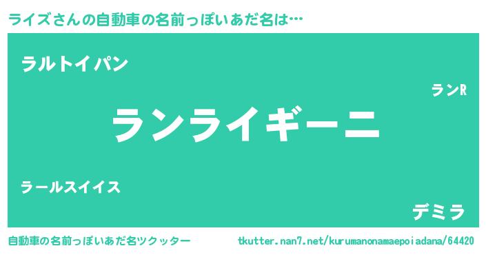 ライズさんの自動車の名前っぽいあだ名は… 『ランライギーニ』『ラルトイパン』『デミラ』 ツクッター #自動車の名前っぽいあだ名ツクッター http://tkutter.nan7.net/kurumanonamaepoiadana/64420/