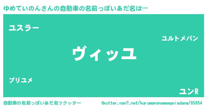 ゆめていのんさんの自動車の名前っぽいあだ名は… 『ヴィッユ』『ユスラー』『ユンR』 ツクッター #自動車の名前っぽいあだ名ツクッター http://tkutter.nan7.net/kurumanonamaepoiadana/65854/