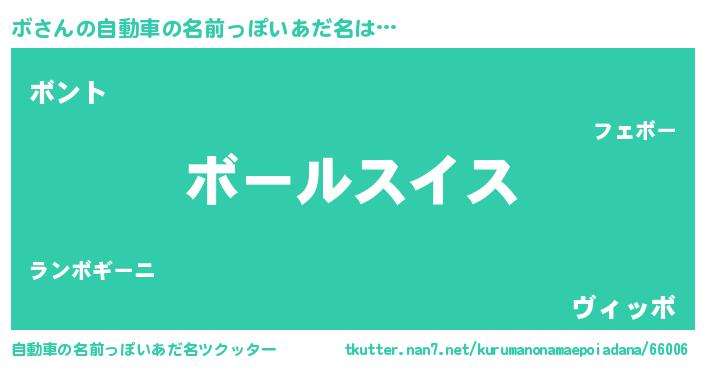 ボさんの自動車の名前っぽいあだ名は… 『ボールスイス』『ボント』『ヴィッボ』 ツクッター #自動車の名前っぽいあだ名ツクッター http://tkutter.nan7.net/kurumanonamaepoiadana/66006/